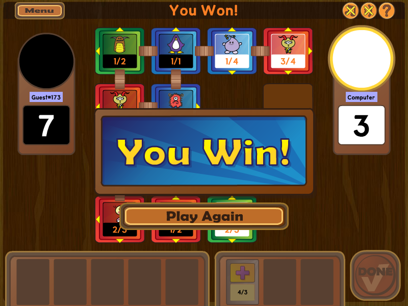 From here we worked to make Creature Capture as flashy as we could make it. We spent much of our effort making the animations as fun as possible. For example, we added the aforementioned animations around celebrating and mourning when a battle is won or lost. We also added a lightning animation that announces the start of a battle and a victory animation at the end of a level, among others. Our improvements included hover effects for hints, an animated scoreboard at the top, and the ability for players to choose their avatar and card color.