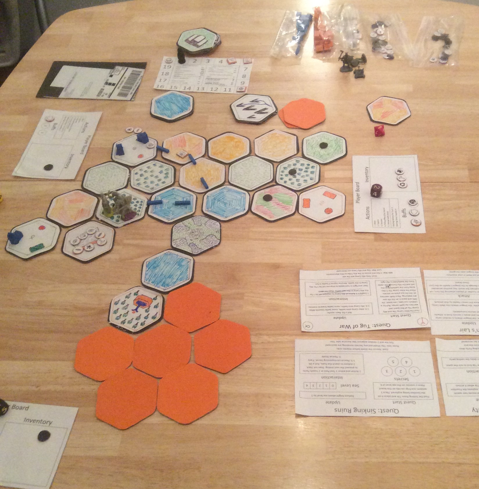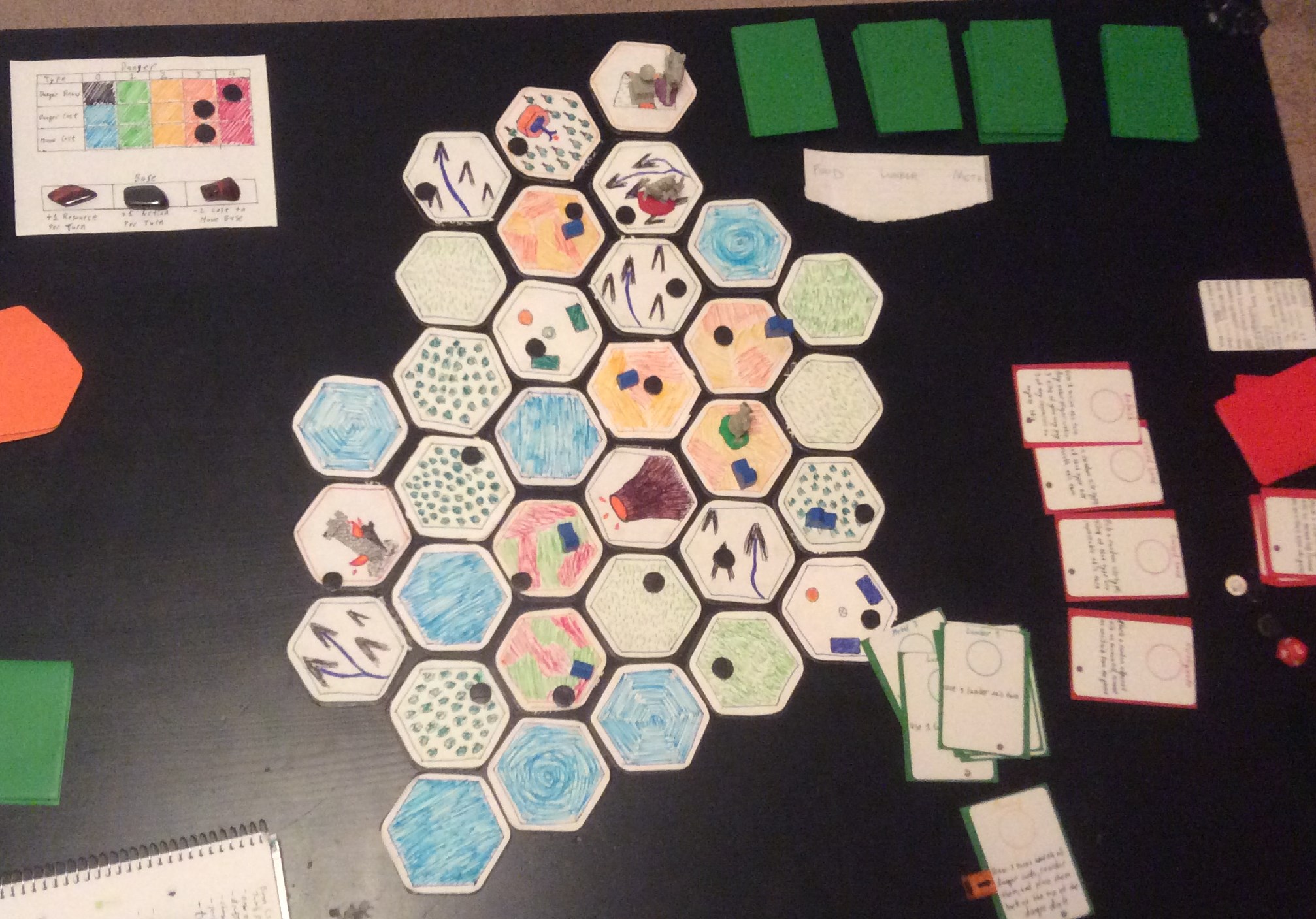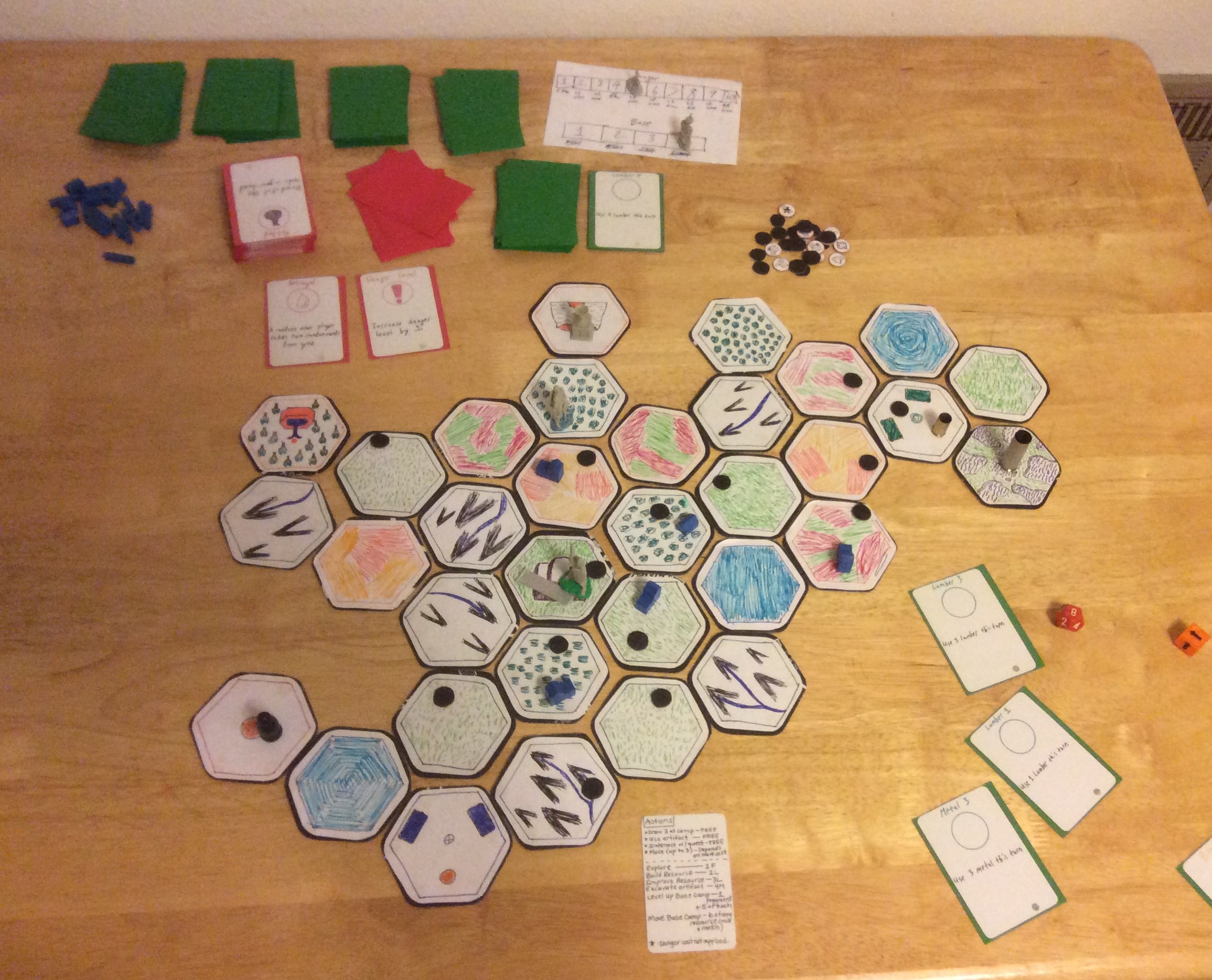 Biomes is playable as a board game in which players play cooperatively and against the game board. Players harvest resources, explore and quest within the bio-sphere, and eventually escape to win. Danger also lurks in each bio-sphere. If the danger level gets to high the players become overwhelmed and lose the game.