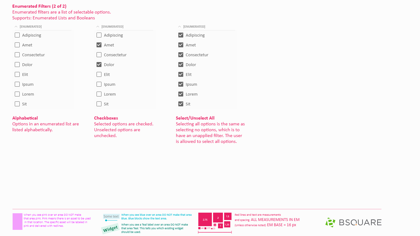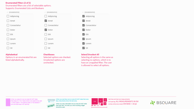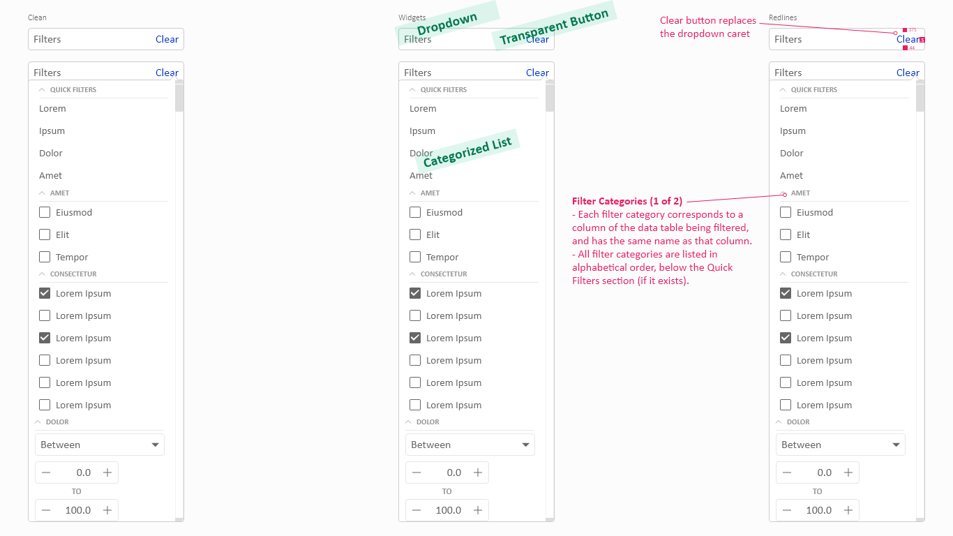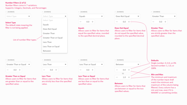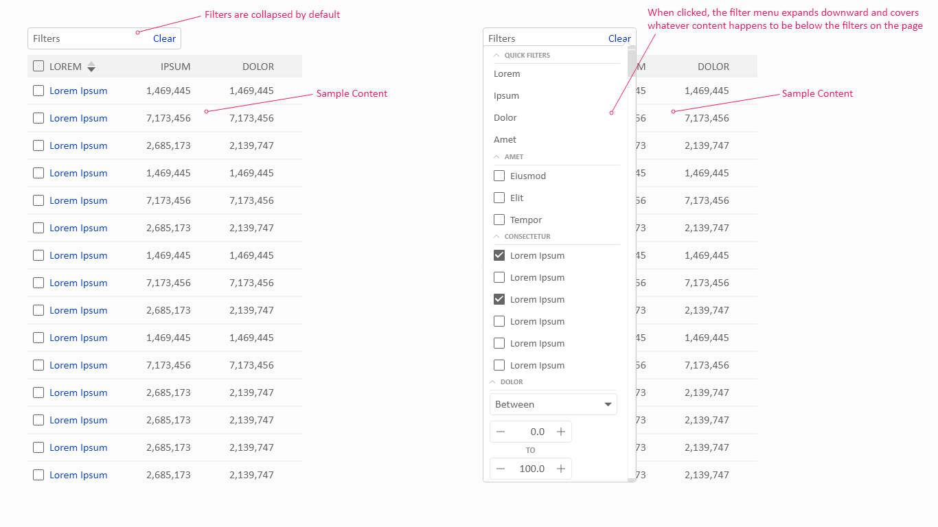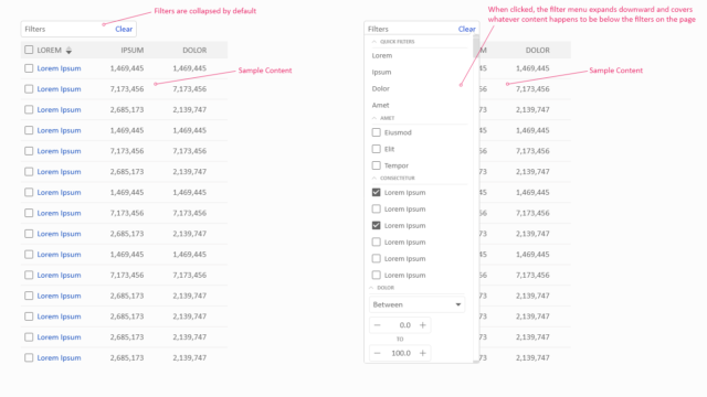 Filters exist to allow users to refine a list of items, regardless of how that list is presented and are designed to take up minimal space so that they can be used in a myriad of situations. The filters specification includes the interaction rules for how the different data types are supported.