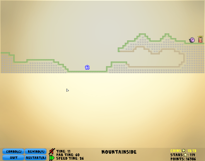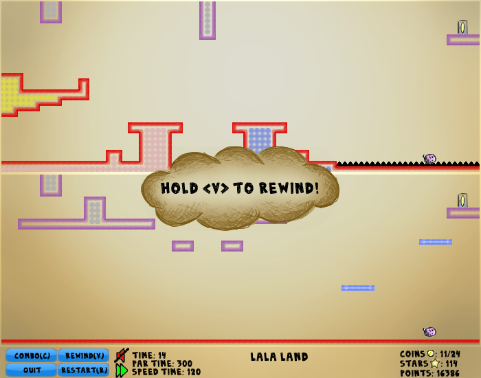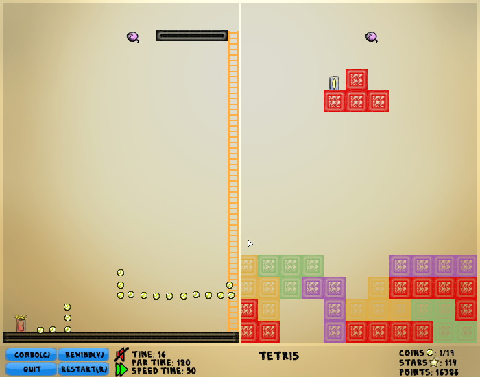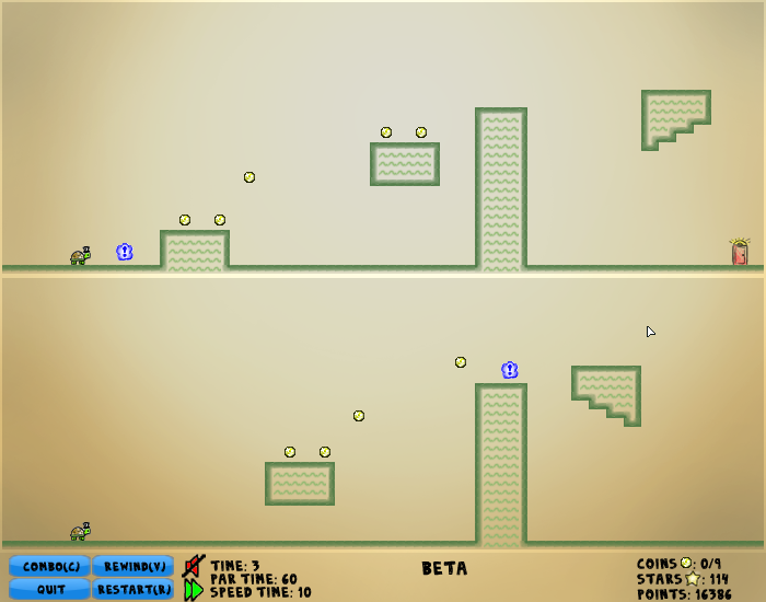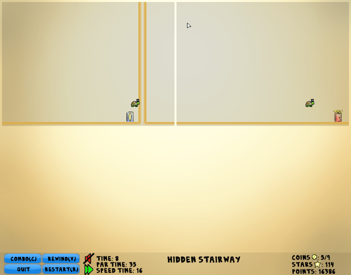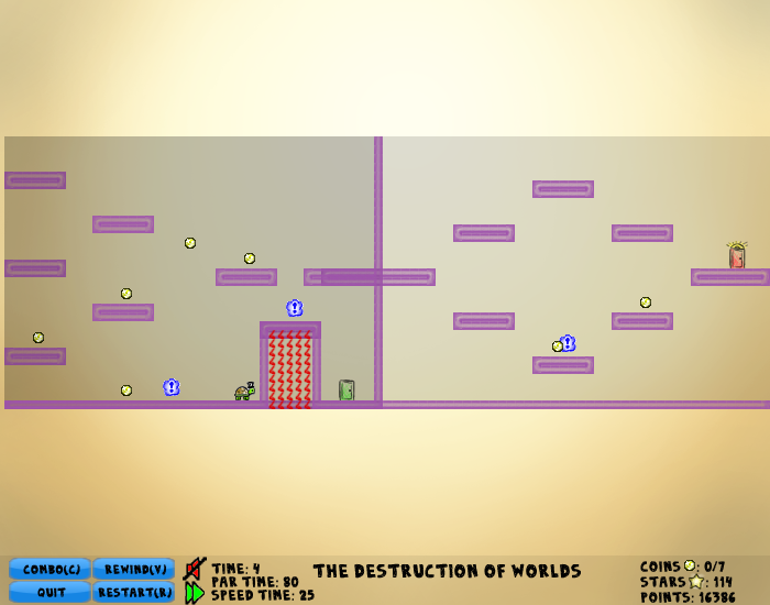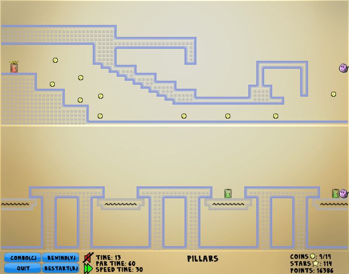 Each level is split into pieces, called worlds, each containing a portion of the level. Multiple worlds are usually on the screen at one time. The character interacts with anything that is in any of the visible worlds. Is there a wall in your way in one world but not the other? Then there is a wall in your way! You can see the union of the visible worlds by holding C, allowing you to see the true level you are exploring, but you cannot move while doing this.
