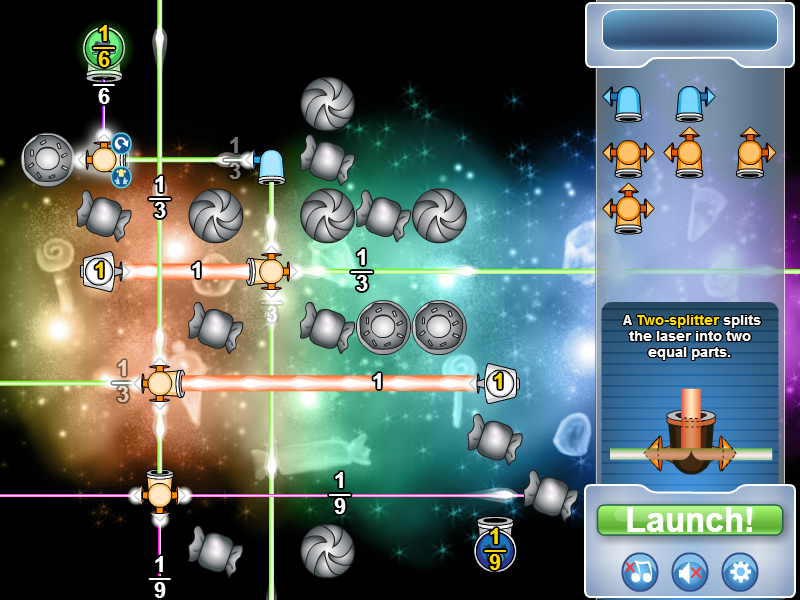 We used a system of just-in-time hints in Refraction Remix to remind players of what each of the game pieces did. For all game pieces such as benders, splitters, adders, asteroids, and ships we created short animations to explain the mechanic visually. We also added a brief message to explain the big idea the player needed to know. We set these hints to display on the bottom of the piece bank, which was generally unused space. For the various pieces, the respective hint would appear whenever the player hovered over a piece.